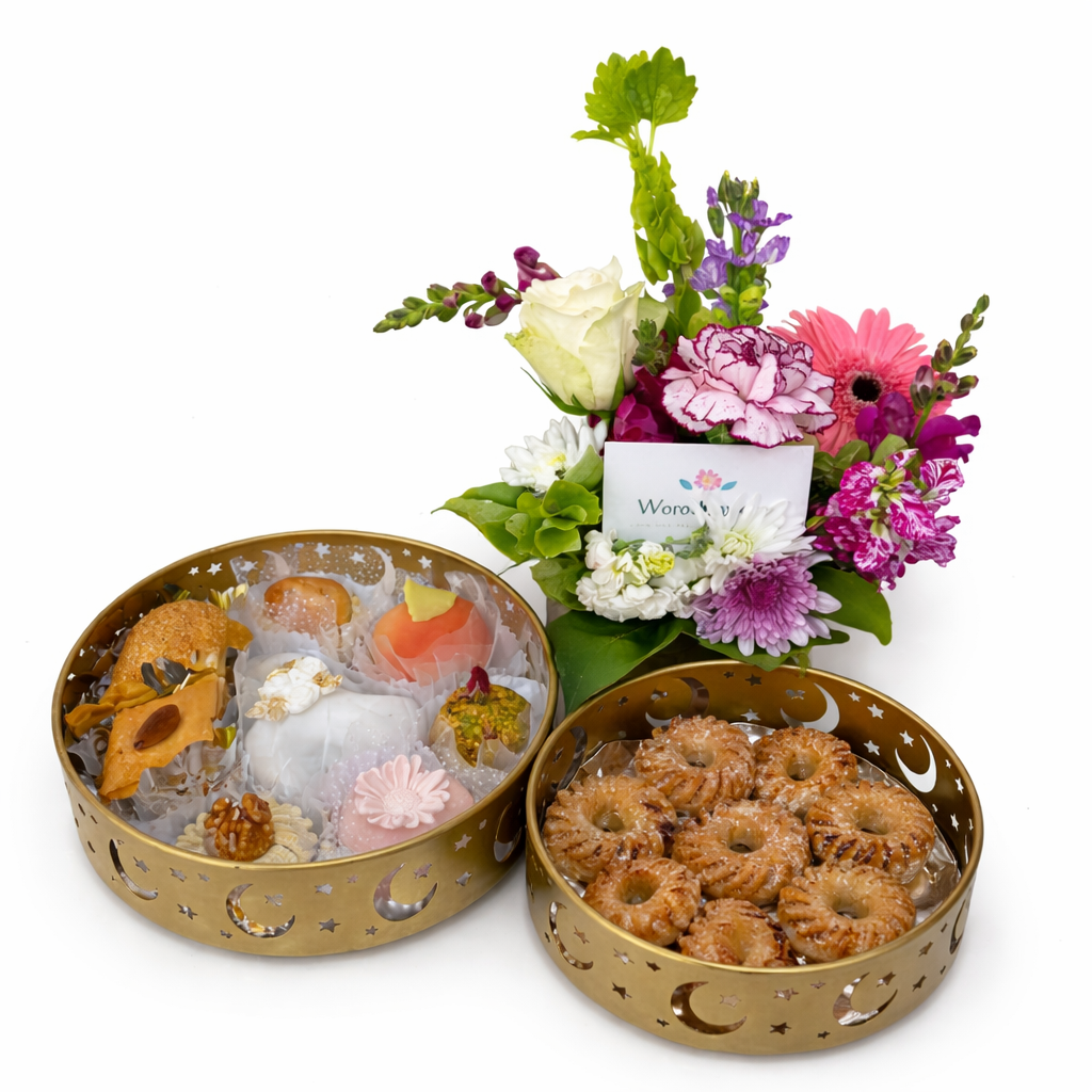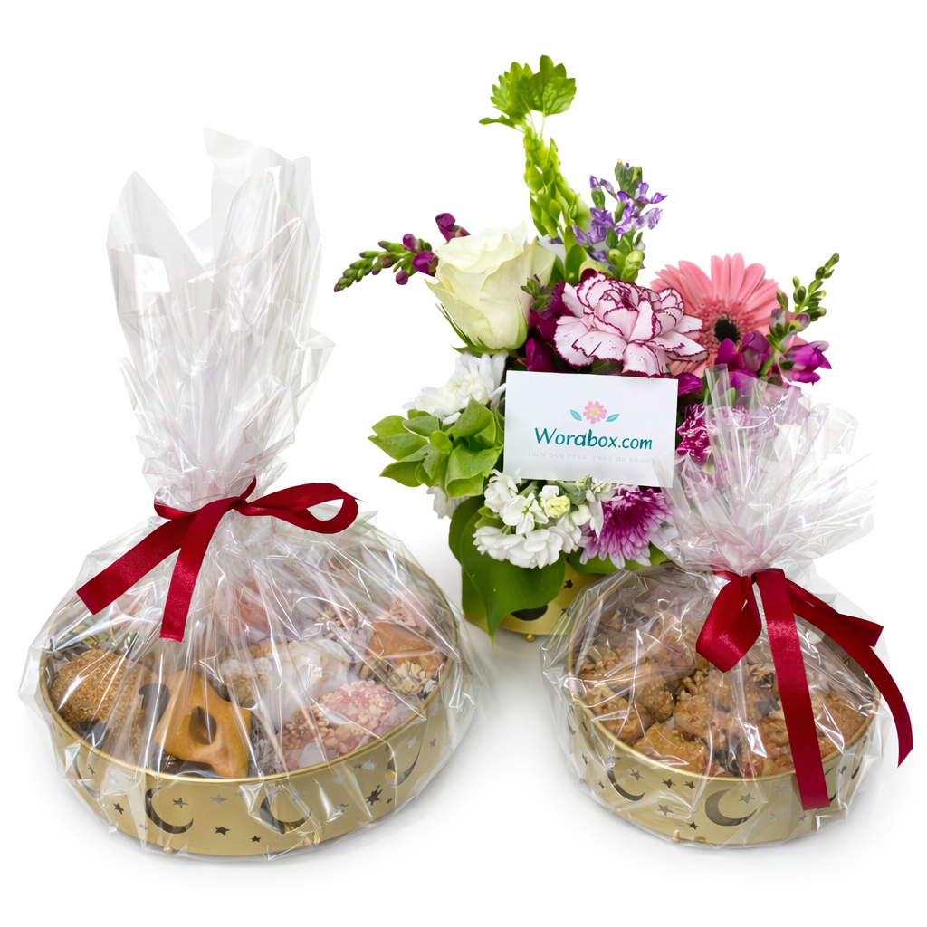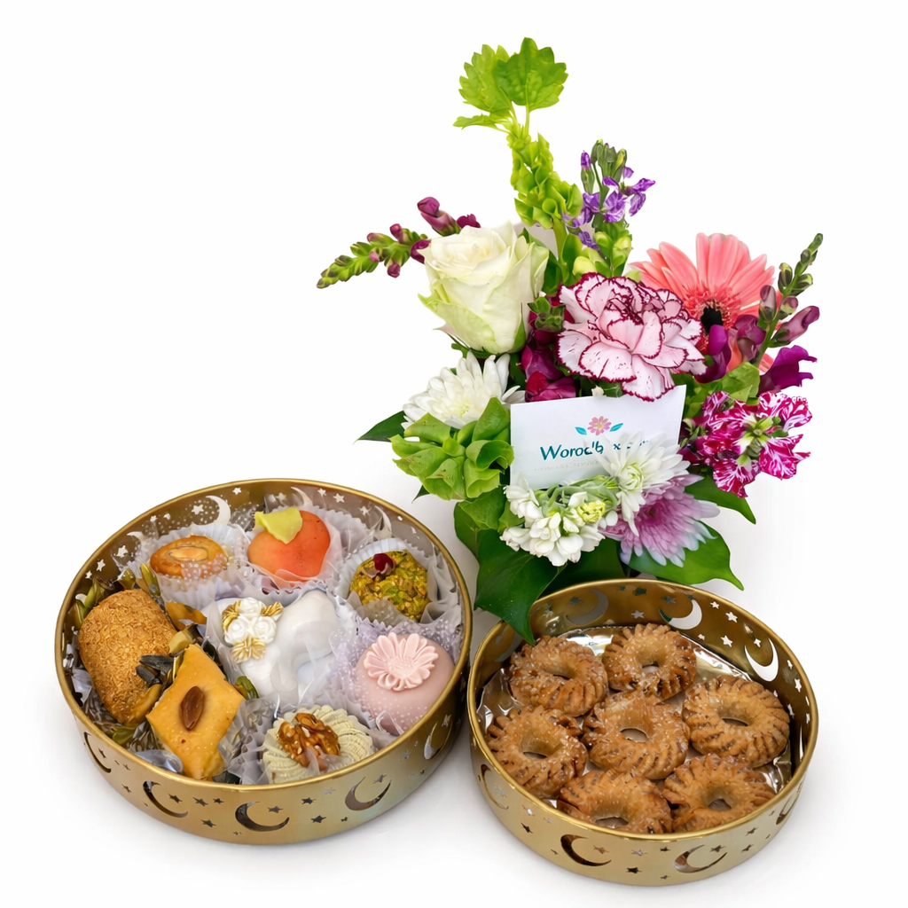 A l’occasion du Eid el fitr souhaité une bonne fêtes avec ce magnifique coffret se compose de deux plateaux dorés décoratifs aux motifs orientaux, remplis d’un assortiment de délicieuses pâtisseries traditionnelles.