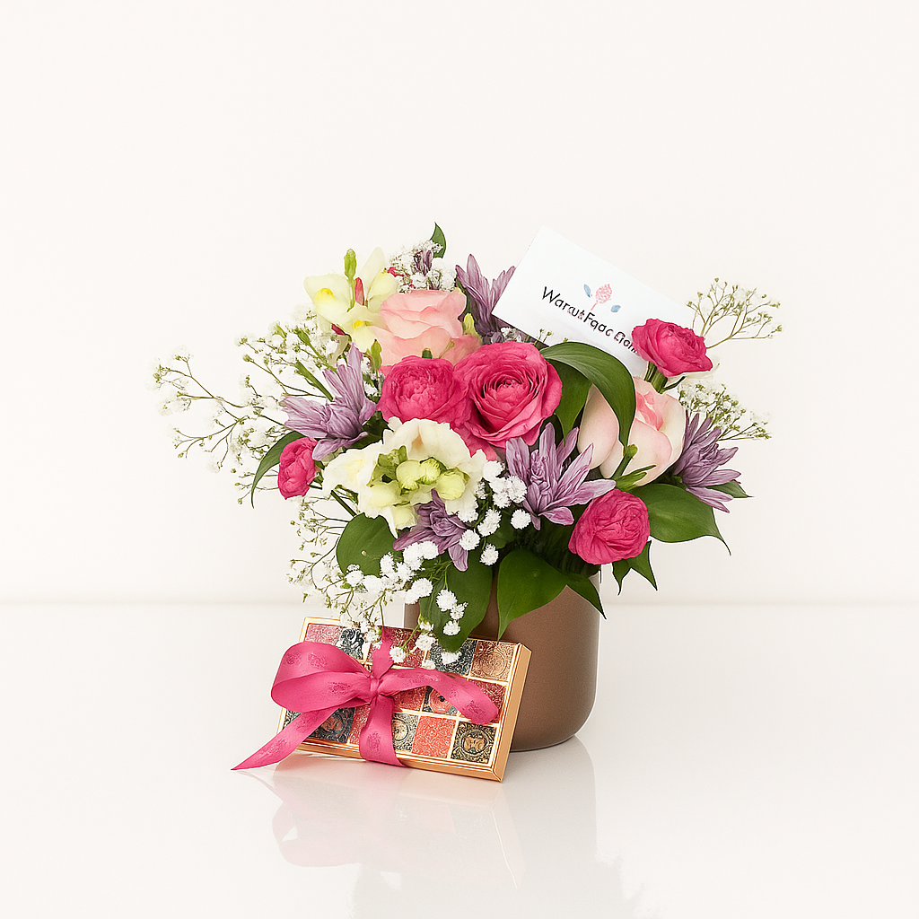 La composition florale se distingue par un subtil mélange de roses fuchsia et pastel, de fleurs violettes, blanches et crème, sublimées par de délicates gypsophiles et un feuillage vert éclatant.